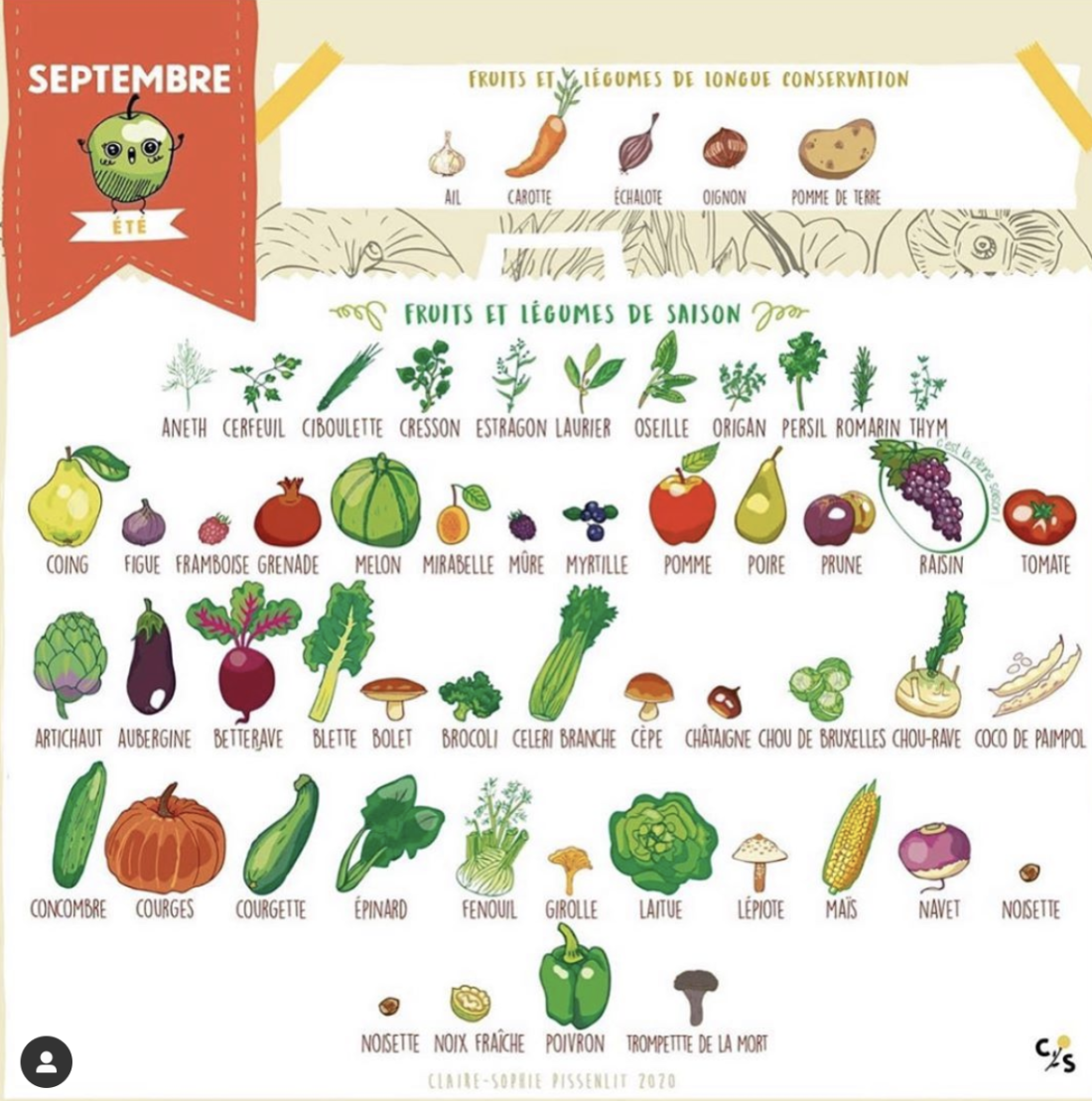 Ce n’est pas parce que la rentrée est chargée et que j’ai de nouveau des journées de dingue que je vais oublier de vous partager le désormais mythique “Calendrier des fruits & légumes de saison” de @clairesophiepissenlit.
